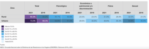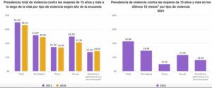Mientras que, de octubre 2020 a octubre 2021, 42.8 % de las de mujeres de 15 años y más experimentaron algún tipo de violencia, la violencia psicológica es la que presenta mayor prevalencia (29.4 %), seguida de la violencia sexual (23.3 %), la violencia económica, patrimonial y/o discriminación (16.2 %) y la violencia física (10.2 %).