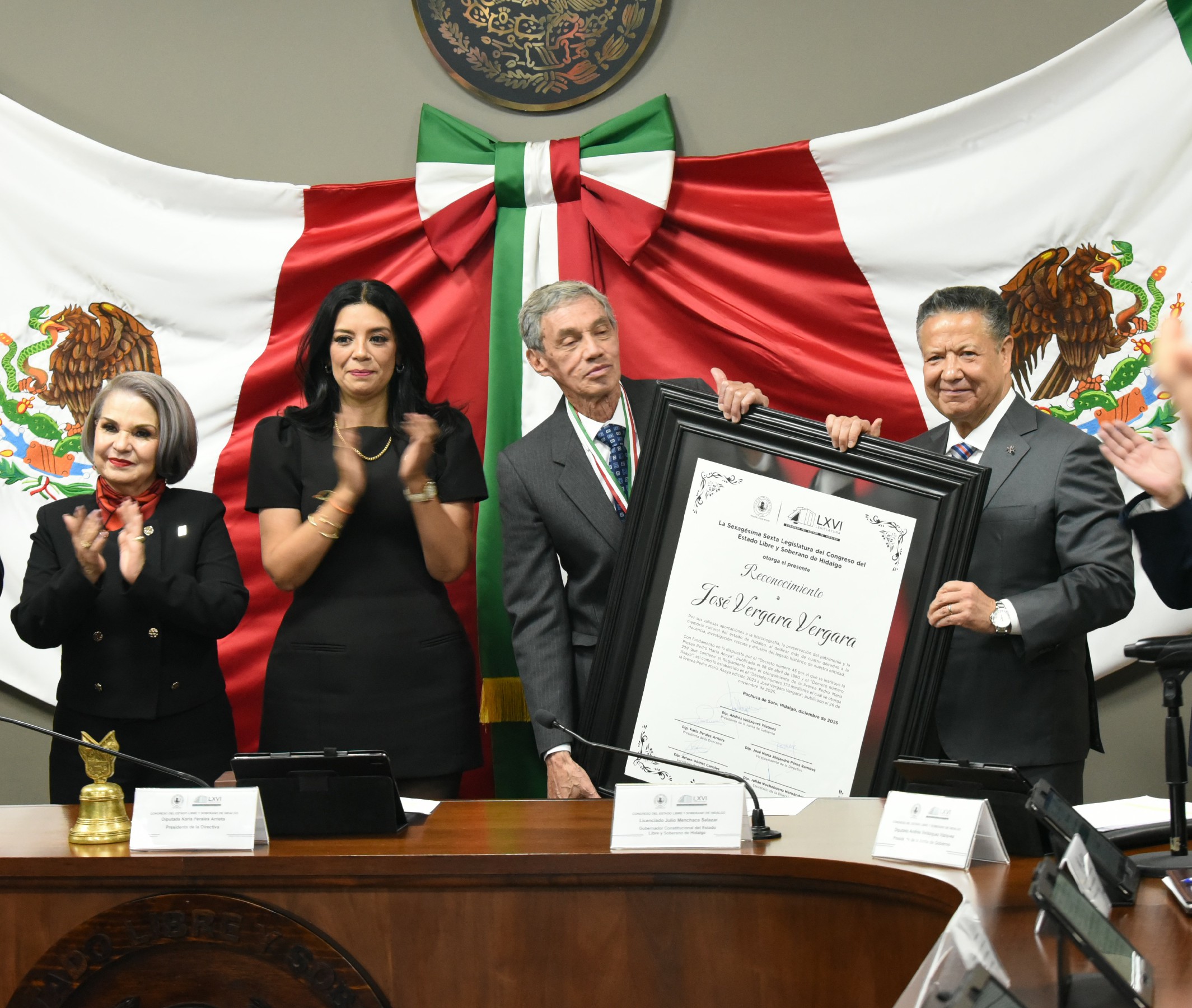 La diputada Karla Perales Arrieta, presidenta de la directiva de diciembre, celebró el dictamen emitido para distinguir a José Vergara, “cuya trayectoria constituye un verdadero testimonio de devoción intelectual. Su labor rigurosa, tenaz y profundamente humana, ha permitido que el pasado virreinal de Hidalgo deje de ser un silencio y se convierta en una presencia viva”.